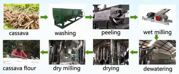 Kek tepung ubi kayu yang terhidu mengandungi kelembapan yang tinggi hingga 45 ~ 50%, yang tidak boleh masuk ke dalam pengering secara langsung dan akan dicampur dengan tepung kering dan mengurangkan kelembapan hingga 38%, kemudian diangkut ke tempat makan pengeringan oleh tali pinggang, melalui feeder dan masuk ke dalam penambang. Sumber haba pengering adalah penukar panas wap. Tepung ubi kayu basah dipanaskan oleh angin panas dan air dikukus. Selepas pengeringan, tepung ubi kayu dan udara dipisahkan dalam pemisah siklon. Di bahagian bawah pemisah siklon, ia ditutup dengan udara lebih dekat. selepas udara meninggalkan cyclone pemisah, yang dilepaskan ke atmosfera. Tepung ubi kayu yang dikumpul dibawa ke unit ayakan getaran; bahan zarahan yang kasar itu disuarakan. Tepung ubi kayu yang disumbat dibawa ke corong untuk menyimpan dan menyejukkan.